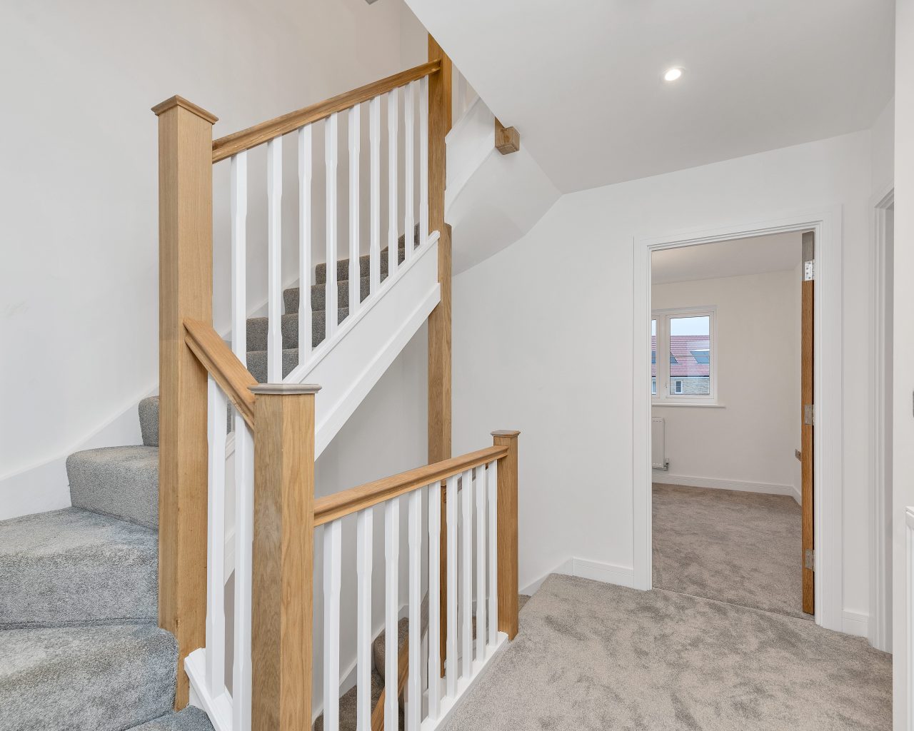 • Oak newel posts and handrails; V-groove skirting and architraves finished in satin wood