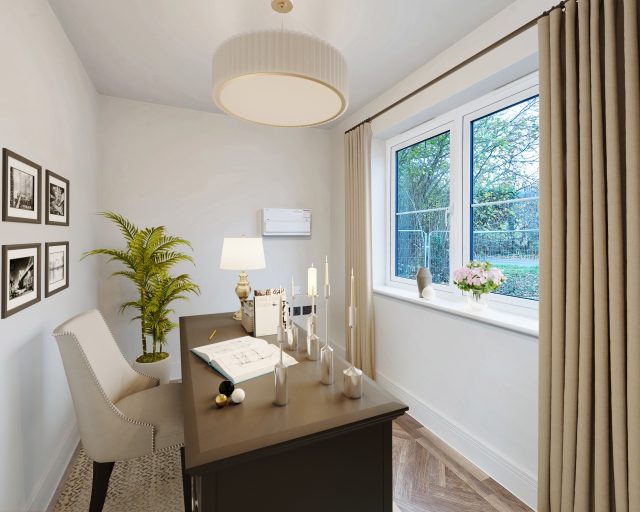 The heart of the home is a generous open-plan Kitchen/Dining Room stretching across the rear, complete with a feature island and plenty of room for both relaxed family mealtimes and entertaining. Bi-folding doors lead directly to the garden, creating a natural flow between indoor and outdoor living. Just off the kitchen, a cosy snug provides a flexible additional living area – ideal as a playroom, TV den or reading nook – while a separate study to the front caters perfectly to home working or quiet focus.