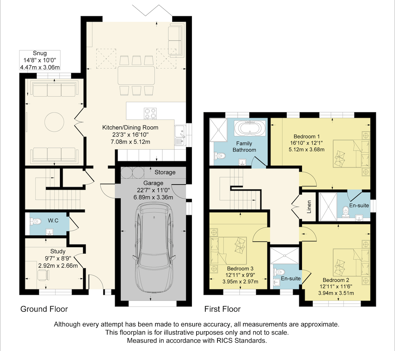 Upstairs, the accommodation continues to impress with three spacious double bedrooms, all beautifully proportioned. The Master bedroom boasts a large en-suite shower room, while bedroom two also enjoys the benefit of its own en-suite – ideal for guests or older children. A well-fitted family bathroom serves the remaining bedroom, and a useful linen cupboard completes the landing.