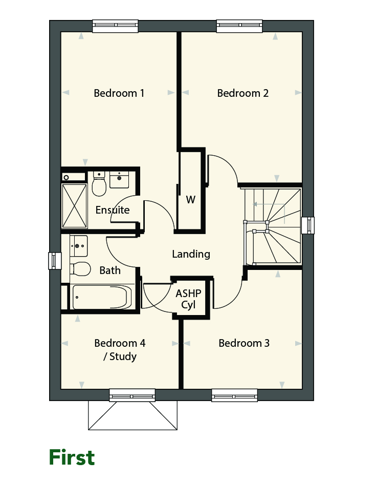 Upstairs, you’ll find four well-proportioned bedrooms. The main bedroom features a private ensuite, and the family bathroom is ideally positioned to serve all bedrooms.