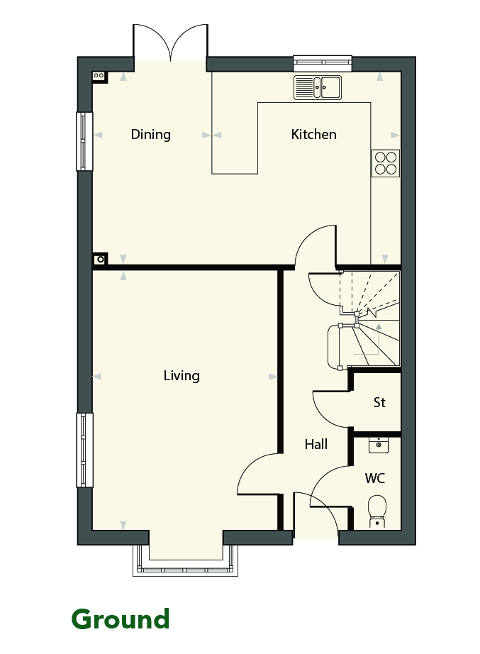 - Open-plan kitchen/dining with French doors