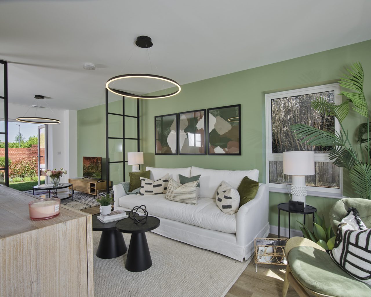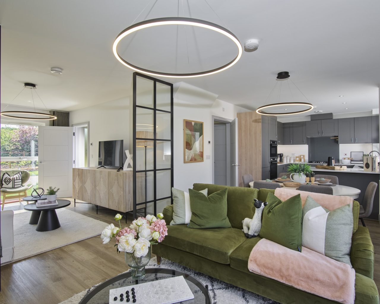 - Separate living room with contemporary Crittall-style screens.